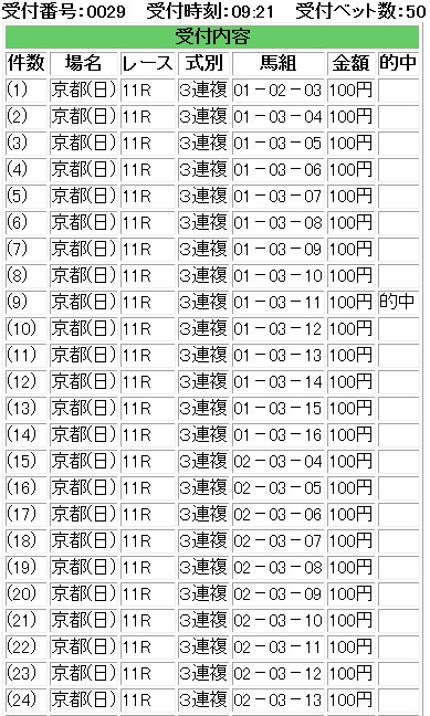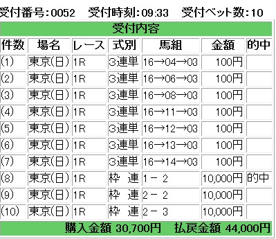 さて・・・ここのところ買い方についてずっと考えているんだが・・・・これも繰り返しなんだけれども・・・最大の倍数を探らなければならない。こないだも書いたと思うが・・・・総和になる数字が10とした場合・・・これを構成する数字を使って最大の倍数を出すには5×5が最大の倍数になる。的中率と回収率の場合もこの関係が生きてきて・・・・・以前は黄金比という言い方をしていたと思うが・・・・上ブレに寄せすぎてしまうと・・・・・これまた回収金額が落ちるし、回収率も落ちる。つまり・・・損益分岐点のオッズはどこかを探る必要がある。一応・・・今の私の買い方・・・・過去の結果からトリガミは悪だという結論を導き出した。トリガミが起こりうる馬券は決して買ってはいけない。無論、その券種単体での話だけれども。で・・・これ金曜日分の日記なので・・・わざわざ過去の分まで読んでいる人しか読まないと思うが・・・・もしくは土曜日分を記載する前に読んだ人かな・・・・私は現在・・・オッズを点数の最小限の倍率で切っている。つまり・・・300点買ったら300倍以上。400点買ったら400倍以上で・・・頭数と買い目の組み合わせで切るオッズを決めている。で・・・これでも過去の結果を検証する限り・・・・十分に勝てるオッズ切りなんだが・・・・・これをさらに無駄を省きたいのだ。損益分岐点の最小限で買っているが・・・・これは勝てるオッズ範囲の下限なんじゃないかと言う気がしている。本当は・・・もう少し上のオッズで切った方がいい結果になるんじゃないかと思っているのだ。なので・・・どのオッズ帯が・・・・獲れていて、且つ最大限に効率がいいかを探る必要があるかと思っている。無論・・・・オッズは直前まで変動するものなので・・・ある程度の安全域と言うか・・・・・バッファーは必要だけれども・・・ギャンブルの勝ち方は最低ラインを越えたらコストダウンしかないのだから・・・・どれだけ無駄なBETを省けるかだ。そして・・・均一金額のBET。この2点がどうしても必要になってくると思っている。ただ・・・加速させすぎると・・・・パンクのリスクもあるしな・・・これがほぼ自動システムのようにできればいいんだけれども・・・まあ、最近は大分それができていると思うけれども・・・・そういえば・・・BJさんにいただいたコメントに・・・カジノが日本人も行けると記載があった。無論だが・・・・できたら一度は行かなければならない。それこそ帯持って。ルーレットで・・・・流れの無い奴を探し・・・・とことん逆張りしてやるのだ。ルーレットとブラックジャックだな・・・バカラはやったことないが・・・・まず負けそうだしな。そういえば・・・これまた次の日記でも記載するけれども・・・こないだ書店行ったら・・・・LINEスタンプの作り方とか書いてある本が存在した・・・無料も有料もできるようなのだが・・・・これ・・・面白いんじゃないとピンときた。ギャンブルで大破滅名言スタンプとかつくって・・・・無料でばらまけば・・・・SEOになるんじゃないの?と。まずはやってみようかなとか思っている。何倍できるのがBET上良くなるか・・・・再度検証したい。