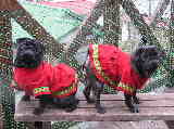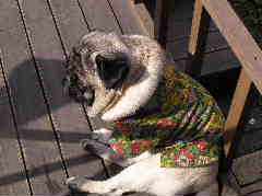 パグにはやっぱり・・チャイナ服と言うことでチャイナ服を作ってみました。どうですか?似合いますか?男の子の方はちょっと分かりづらいですが、デザインは女の子が着ているのと同じなんです。子供たちから、わんこで完全に遊んでいると言われました。 ライム君です。久しぶりに暖かい日だったので、デッキでうたた寝しています。 レモンです。パグではないけれど・・・中国原産だから、何となくいい感じかも・・・ 上から見るとこんな感じなんですよ。ちょっとチャイナ服っぽいでしょう。(^_-) くるみちゃんです。 わかりにくいですが、まろんなんです。上から見たらくるみもまろんもわかりにくいですね・・・^^; ところで、ゴエモンですが、皆さんご心配頂き有り難うございます。薬も少しずつ効いてきたようで、歩き方もだいぶんよくなってきました。でも、まだ外には行きたくないらしく、散歩に行こうとは言いません。でも、今日は、すこしいつもより暖かいので、窓辺で過ごしています。家の中は歩き回るようになってきましたし、「ゴミ箱あさり」をする気力も出てきたみたいなので、少し安心しています。早く、外に行けるくらいに回復してくれればと思いますが・・・焦らない、焦らない、ですね。(^_-)