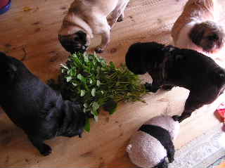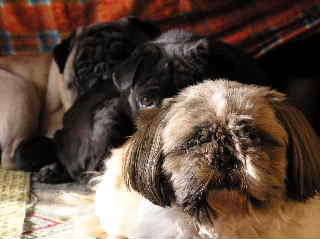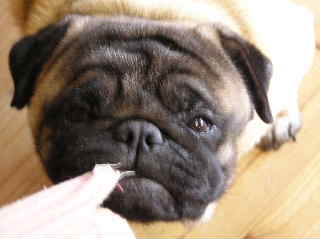 最近、レモンとライム、よくケンカをしてるんです。ほとんどが、レモンがライムの近くで、「う~、う~」唸って、それに対してライムが飛びかかってしまうんです。けんかしてもたいていライムの方が強く、レモンは負けてばかりなんですが、気の強いレモンは、決して引き下がりません。と言うかレモンはとにかく執念深いというか・・・なんというか・・・ ライムの方は、ほとんどケンカする意志はなく、ある程度までは我慢しているようなんですが・・・・まだ若いので、我慢できなくなって飛びかかるというか・・・ 時々、ライムは、果敢にゴエモンに挑んでいくんですが、だいぶ弱っているとはいえ、ゴエモンですから、全く相手にもなりません・・・やっぱり、男の子同士って、こんな感じなのかなあ・・・ このケンカ納めるにはどうしたらいいのかなあといつも考えているのですが・・・やっぱり、パグだからたべものしかないかなあ・・・ 昨日、試しにブタ耳で釣ってみたらケンカが収まった・・・やっぱこれしかないかあ~。 でもなあ~、ゴエモン君、ブタ耳さんとっても好きなんだけれど、消化器官が弱っているので、食べられないんです。食べちゃうと、どうしてもゲリラに襲われてしまって・・・とにかく消化にいい物しか食べられなくて・・・他のわんこがブタ耳食べてるのに、彼だけ、他のおやつなんです。かわいそうなんだけれど、仕方ありません。もちろん、ジャーキーとかもダメ・・(^^;)ゴエモンに何か言いおやつ考えないと・・・