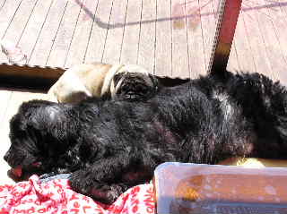 今日も、朝からとってもお天気がいいので、やっと毛布をお洗濯。ついでにわんこもお洗濯。暖かくなってきたので、パグズの抜け毛がものすごい・・・特にライムは、なぜかアンダーコートが他のパグより多いみたいで、ブラッシングしても毎日ものすごい量・・・やっと今日シャンプーしたんで、少しは落ち着きそうだけれど。シャンプーの後のひととき。ゴエモンとライムはひなたぼっこです。他のパグズは、こたつの中・・・一暴れした後だから熟睡しているみたい。最近このパグズの結束力に驚かされるんです。本当にいつも3匹一緒。私の後をいつも3匹で付いてくる。ライムとレモンがケンカしそうなとき。一足早くくるみが、レモンに向かって吠え立てるんです。「くるみ~、二匹をあおってるぞ~」みたいな感じなんですよ。そして、まろんとくるみは、いつもライムの味方。レモンは、完敗ですよね。レモンは、くるみと相性良くないみたい。レモンは、まろんとは遊ぶんですが、くるみとは遊ばない。くるみは、ほとんどレモンのそばには寄らないんですよね。不思議です。ライムは、まろんとくるみ、どちらとも遊ぶんですが、これがまた、何をされても困ったような顔をしてるだけで、決して怒らないんですね。どうしてだろう?レモンはまろんと遊んでいるとそのうち本気になって怒ってるんですが・・・レモンの気性の激しさはすさまじいですから・・・やっぱり、この子はあまりにも早く、親元から離してしまったのが行けなかったみたいです。子犬は、最低二ヶ月は、親元にいることが理想ですね。つくづくそう思いました。あまり早くに、親元から離すと凶暴性が出るわんこがいるらしいんです。このレモンがいい例です。この子は、旦那が早くに手元に欲しいと言うことで生後35日でうちに来たんです。今考えると早すぎです。他の子は、生後60日を過ぎてから我が家に来たんですから。