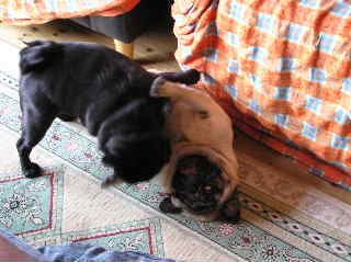 昨日、知り合いの小学校5年生と5歳の男の子2人が、お母さんと一緒に我が家へ、遊びに来ました。とってもわんこが好きで、その中でもパグが好きらしく我が家のパグズをみて、狂喜乱舞状態でした。さすがにゴエモンは、恐いらしく、リードをつけていたら、やっとさわれるくらいでした(それでもさわれるって凄い・・・5歳の子よりゴエモンは大きいんで・・・)良くさわれるなあと思って、話を聞いてみるとなんと以前ブルテリアを6匹、飼っていたことがあるそうな・・・道理で、わんこに対して怖がらないはずです。で、そのこたち、うれしさのあまり、まろんとくるみを触りまくり、追いかけて遊ぶはで、まろんとくるみ、子どもの遊び相手に大活躍でした。いくら好きに扱われても嫌なことされてもじっと我慢していて、とってもいじらしかったです。なかなか小さい子どもは、うちにはこないので、最初はとまどっていたようですが、何しろビーフジャ=キーをおみやげに持ってきてくれて、それを目の前に見せられる物で、24時間空腹のパグとしては、そのおやつが欲しいがタメに必死になっていたようです。それみたると、やっぱり、パグでした。ライムも最初は、ちょっと吠えてたんですが、そこはパグ。おやつをもらった途端、態度が一変。すっかりお友達状態です。全く調子のいい奴らです。そのせいか本日は、わんこたちみんな朝からとってもおとなしい・・・爆睡中です。本当にみんなお疲れ様でした。でも、また来るってよ~。