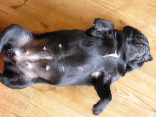 もうすぐ7月も終わろうかとしているのに、まだ梅雨が明けません。暑いのもパグさんにとっては大変ですが、こうも毎日雨だと、少々ストレスたまりそうです。しかも今日は、少し肌寒い・・・7月なのに~。雨ばかりだと、皮膚の弱いライム君は、たまらない様子。ただでさえこの時期、カイカイが出やすいのに・・・先生いわく、このこ、普通のパグより毛の量が多いよ!って、どういうこと?確かにものすごく多いような気はするけれど・・・毛の質も違うしなあ~。私のストーカーにすっかりなってしまって、どこへ行くのにも付いてきて・・・特にまろんは、不安なのもあるのかな?以前より、くっついてます。そろそろ産室を考えてあげないといけません。ゴエモンにとってもこの長雨、あまりよくないみたい。関節の調子があまりよくないみたいで、歩き方が少し・・・やっぱり。暑すぎるのは困るけれど、お天気のほうがいいですね。