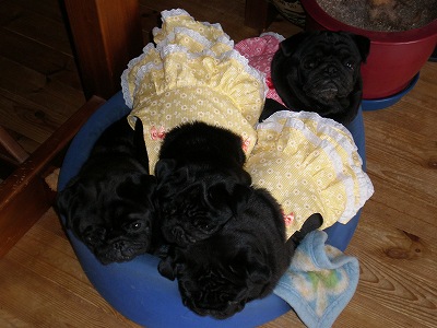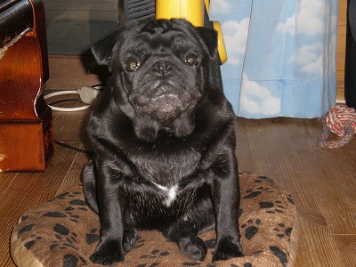 お久しぶりです。何とか無事に大分から帰還後、わんこに振り回されて更新をさぼっておりました。気になっていたシフォンのフィラリア検査。無事に陰性と言うことで一安心。それと、狂犬病の注射。なにしろ病院へ連れて行こうとした矢先に私が怪我をしてしまい・・・旦那さんは、買うけど飼わない人なもので私しか病院へ連れて行く人いなくってね。最近は少しだけ車も運転するようにしているんで、やっと病院へ連れて行くことができました。ほんと、これで一安心です。さてさて、今日は・・・またまたカドラーネタかと言われそうですが、やっぱり最後にこれだけはって・・・どうしてものっけたかった写真。辛抱してみてやってください。滅多にないパグの大盛りですので・・・(笑どうですか?かなりの大盛りでしょ。うちにいる黒パグ4匹・・・見事に一つのカドラーに収まっております。(笑