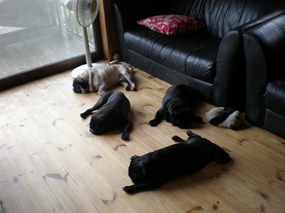 最近は、朝起きると・・・・出てくる言葉が「朝から暑い!」本当・・・もう朝からうだるような暑さ・・・いくら朝からお日様が当たらないとはいえ、風がなくっちゃやっぱり暑い!パグズは・・・扇風機の前でダウン・・・ そしてシフォンさん。パグズよりも参っている様子。涼しいところを求めて放浪中。 ここはトイレの前・・・ちょっとじゃまなんですけど。そしてこの表情です。目だけ動いてます。