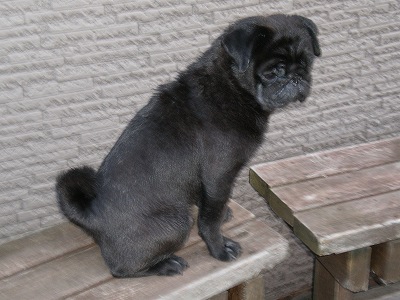 くるみちゃん、先週交配しました。くるみちゃんのこのパグとは思えないお顔をやっぱり残しておきたくて・・・ここ数回連続して失敗しているので、今回は、病院でちゃんと「スメル検査」なるものを受けて、交配時期を確認。そして再度チャレンジです。でもね、今回は、相手がライムくんではありません。いつも失敗するので近くのブリーダーさんにお願いしました。お相手はこの方。 團十郎くんです。彼はアメリカチャンピオン。旦那さんがどうしてもって・・・どことなくまろんさんに似ていませんか?体つきとか・・・体がものすごく大きくって、人工授精でした。かなりの迫力のある子でしたが、とっても人なつっこいかわいい性格でしたね。彼は、まろんとは異母兄弟なんです。つまりお父さんが一緒なんです。くるみちゃんはこんな顔でしょ。 目の大きなおもしろいパグちゃんになるかな・・・今度は赤ちゃん、無事に生まれてくれるといいけどなあ・・・・