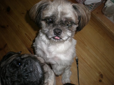 昨晩のこと・・・シフォンさん、ドアの前の涼しいところでねておりました。しかし、その頭のところに、まろんさんの大事な形のないパンダのぬいぐるみが・・・・。シフォンさん、枕に近い状態でねておりました。まろんさん、そのパンダちゃんがどうしても欲しい。でも、シフォンさんが寝ている・・・しばらく迷ったけれど、まろんさん、そのパンダのぬいぐるみを取るべく、ぬいぐるみをくわえて行こうとしました。すると・・・シフォンさんがいきなり「がう~!」とうなり声を上げました。それを聞いてまろんさん、驚いてくわえていたパンダちゃんをぽろり・・・しかし、ゆったりまったり寝ていたパグズ・・・レモン、ライムを先頭に一斉にシフォンめがけて飛びかかっておりました。これには、さすがのシフォンさんもびっくり。あわてて逃げて行きました。まあ、これでパグズの結束力のすごさを身にしみてわかったかも・・・そしてこのパグズの中にシーズーのレモン君もしっかり入ってるんです。もしかして彼はすでに自分のことをシーズーではなくてパグと思っているのかも・・・「僕は、シーズーパグです!」っていってるのかも・・そしてこの方・・・災難に見舞われたシフォンさん。やっぱりまだなじめていないのかな?
