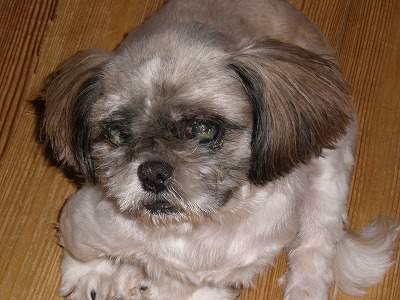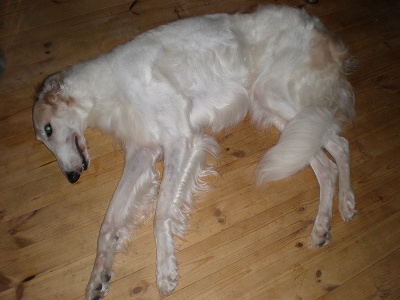 最近、暑いのでロシア原産のシフォンさんは、家にいるときはいつもこの状態・・・ この状態でたいてい目だけをきょろきょろと動かしている。かなり不気味・・・・シフォンさん・・・最近少し変化が・・・自分の感情を表に出すようになった・・・・たとえば食事の前。以前はただうろうろして食事がもらえる順番を待っていたのだが、最近は・・・・「うお~ん、うお~ん」と催促する。そして自分の順番になるとくるくる回って喜びを体で表現。散歩の時。順番で行くと一番最後にうちにきたシフォンさんは、当然一番最後。でも、「早く!早く!」と落ち着かなくなる。うれしいときの感情がよくわかるようになった。でも、相変わらずなんでもないのに手が上の方へ動くと首をすくめる。これって訓練するときか何かの時やっぱりたたかれてたのかな?特に旦那さんが手を動かすと怖いみたい。今までたたいたことなんてないのになあ・・・これはまだまだ直らないかも・・・そして相変わらずパグに遠慮している。このパグ軍団、とってもヤキモチ焼き。最近シフォンも頭を膝に乗せたりとか甘えてくるようになったんだけれど、それをパグズが発見しようものならもう大変・・・みんなでやってきてシフォンを追い出しちゃう。なのでパグズに見つからないようにしないと・・・これまた大変。