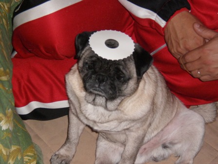あのね、僕がね、お父さんの横に座ってらね。お父さんたら、こんなことしたんだよ・・・ そして今度はまろんにもやってるんだよ。しかも、とれないようにゴムまでつけてさ!どう思う?