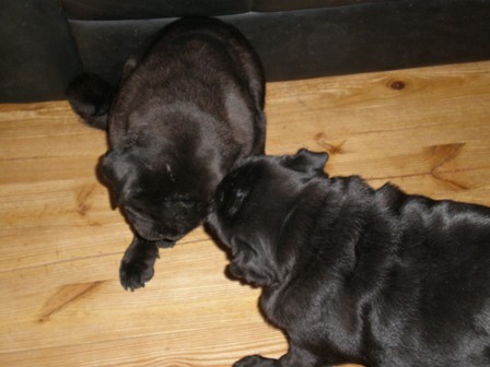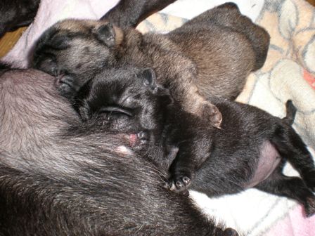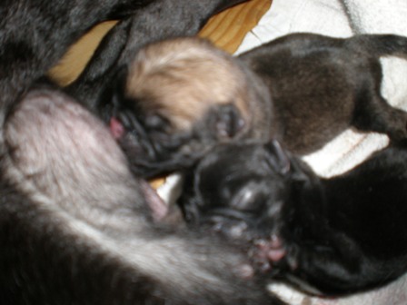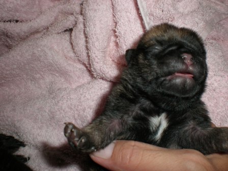 くるみの赤ちゃん・・・男の子と女の子。クロが女の子、フォーン?(アプリコットかも・・・)が男の子。小さいけれどとっても元気。小さい女の子。95グラムで生まれたけれど今日、やっと101グラムになったよ。くるみの母乳もたくさん出るようになって、2匹では飲みきれないほど。これから少しずつ大きくなっていけばいいなあ~。男の子も、128グラムで生まれて今日は、136グラムだったよ。でも、生まれたてのフォーンのこって鼻はピンクだし毛色が違うでしょ。これから少しづつパグらしくなっていくんだよ。