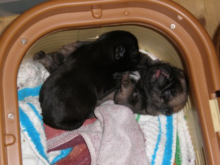 こんばんは。旦那さんがインフルエンザにかかり、子犬と旦那さんの世話に忙しい毎日です。子犬は、少しだけ母乳を飲む量が増えたのか・・・最近は3時間おきくらいにしかおきなくなりました。男の子は360グラム、女の子も212グラムと順調に大きくなってきました。あまり大きくなったので、今までのカゴからお引っ越ししました。少し大きめのお部屋へお引っ越しです。兄弟仲良く寝ています。少しずつ動くことも多くなり今までのカゴでは手狭になったのです。
