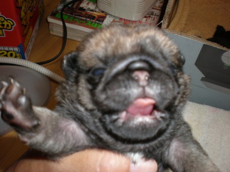 こんにちは。今日はとってもいいお天気。秋晴れです。我が家のメロンさん、昨日で1才になりました。早いものです。兄弟の分までしっかり元気にわがまま?に育っています。(笑さてさて、くるみちゃんの子パグたち。目が開き始めました。まだまだぼんやりとしか見えていないようですがそれでもつぶらな瞳がのぞいています。マロンやいちごは何かを感じるらしく、しきりに子パグのいる部屋へ入りたがります。くるみが嫌がっているようなのでまだまだご対面は後ですね。