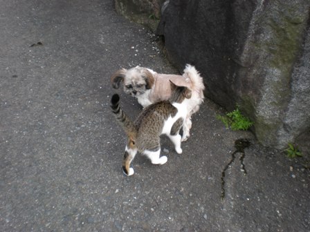昨日の散歩の時のことなんです。最近はくるみが妊娠しているのでゆっくり歩くまろんと二匹で散歩に行きます。 マイペースのまろんと大きなおなかで歩くくるみとちょうどいいみたいなんです。 そこへ我が家にいる二匹の猫さん達が乱入( ̄○ ̄;) 全く動じない猫さん達と無視しているようなまろんとくるみです。