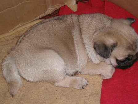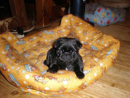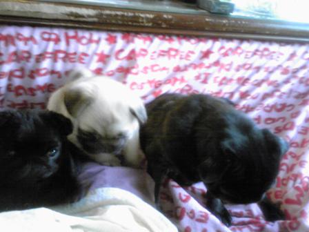 おはようございます。最近は、朝からどうもすっきりしないお天気が続いている九州です。ここのところいろいろなことがあって子パグの写真のっけてなかったので、久しぶりの子パグたちです。なかなか進まなかった離乳も無事に終えて、毎日たくさんご飯を食べて大きくなってきました。足腰もしっかりしてきて、走れるようにもなりました。パグズのなかに混じってしっかりパグズライフを楽しんでいるようです。シフォンは、相変わらず子パグから逃れようと必死です。(笑黒パグの女の子、しっかりカドラーを独占中です。久しぶりのダブるへそ天。なぜかレモンが好きな女の子。