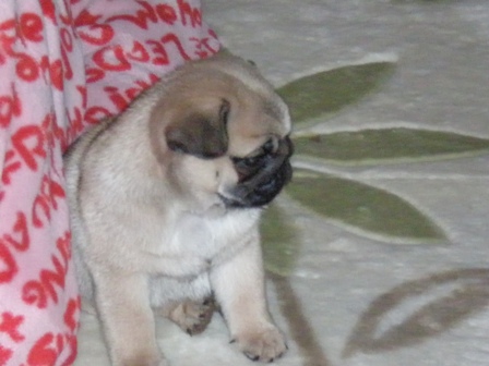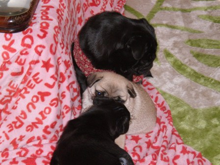 おはようございます。今日も朝からどんよりと曇って、今にも雨が降りそうな天気です。確か昨日までは午前中は晴れるなんていってた気がするけど・・・お洗濯物が乾かなくて困っています。さてさて・・・子パグたち。毎日元気に遊んで眠って・・・大人のパグズも慣れたみたいです。ただ慣れないのがシフォンさん。ソファーに寝ているときにソファーから出ていた足を触った子パグに威嚇。みかんがすかさず飛んでいきました。今は、ライムと完全にボスの座を交代した感じ。みかんは正義感が強いのかわからないけれど、なぜか女の子たちに気に入られています。女の子には決して怒らないからかも・・・そしてくるみちゃん。我が子ながら全く関心を示さず・・・完全に育児放棄状態。子パグたちも感じているのか、くるみよりもまろんやメロンによっていきます。特にメロンはまだ1才ということもあってか、良く子パグたちと遊んでいます。時にはメロンが本気になったりしてますけどね・・・(笑メロンが子パグたちが遊んでいるところへ参戦。おもちゃを狙っています。ゆずと琳が遊んでいたおもちゃをメロンに持って行かれて取り返そうとゆずががんばっています。メロンは本当に子パグたちに優しいです。いちごは自分の子以外には無関心。メロンにはとても優しいのですが・・・そうそう、琳ちゃんは、今月27日に新しい飼い主さんちへ旅立つことになりました。2匹で遊ぶのもあとわずかです。
