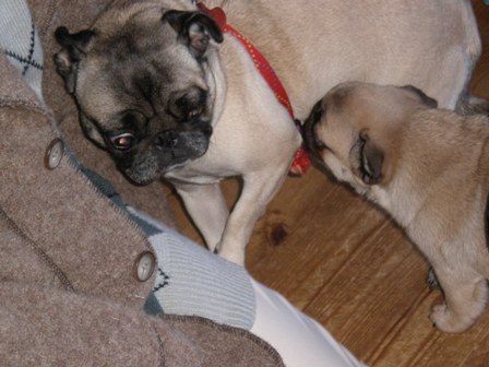 おはようございます。今日は祭日だけど、旦那は朝から2時間ほど仕事、息子はいつも通りに予備校と平日と全く変わらない朝です。まあ、でも旦那が朝早くに出かけたから幾分朝がゆっくりかも・・・さてさて・・・子パグとメロンちゃん。最近は本当にまるで親子のよう。子パグがメロンの後を追いかけています。まるで親子のようにゆずと琳はメロンに甘えています。