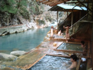 個人的には川岸露天風呂がお勧めである。旅行会社のパンフレットなどによくここの写真が載っているが、それで見るよりも実際は少々小さい感じだ。