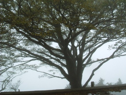 見晴台からちょうど1時間ほどでようやく頂上に着く。期待していた展望は全く無い。とりあえず阿夫利神社の本殿に手を合わしてから休憩。頂上にある雨降木とよばれるブナのご神木が霧に包まれている。幻想的な風景だ。