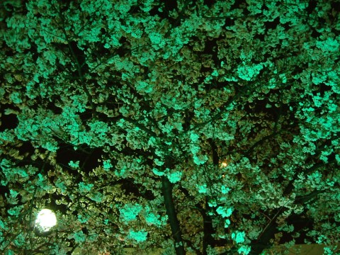 桜橋のところで中途半端なライトアップをしていた。青や緑のライトを桜に当てていた。まあ綺麗といえば綺麗なので、一応写真に収める。