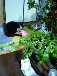 今日も夜、ハナと一緒にジャンプできる方の子猫が遊びに来てランチ。写真撮れたのでアップします。口の回りが丸く茶色でおもろい。