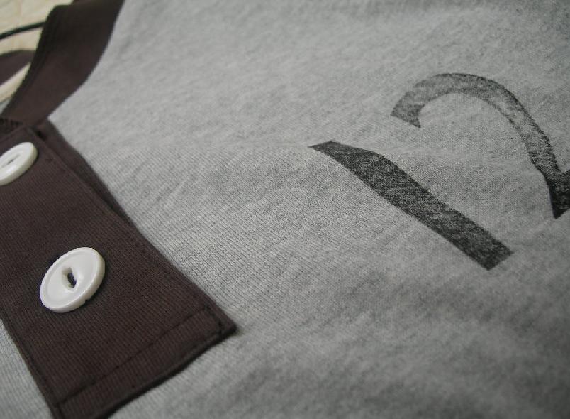肩は濃い茶色で、胸のプリントは紺色のかすれプリントです。