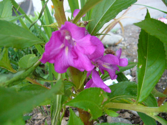 紫のホウセンカが咲きました。地植えのホウセンカ 茎がとても太いです。アリがのぼってきてしまうのが ネック 自然に アリが寄り付かない方法ってあるのかな、、