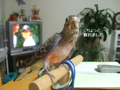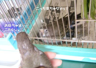 ごぶさたです。。。今日は鳥かごの掃除と部屋の拭き掃除。鳥かごは毎週やろうと思っててもなかなかできないです(^^;)先週末と先々週、さくらを実家に連れて行きました♪やはり忘れているさくら・・・借りてきた猫のようにおとなしいです^^;でもバンバン飛び回って疲れてしまいました。。。なぜかというと・・・実家の大将だいちゃんが追いかけまわすからです。。最初はビビってたんですよ・・・それが、さくらが何もしないとわかったとたん自己主張しちゃってさ~攻撃し出したんですよ~離れていてもわざわざ近寄っていくの・・・時には飛んで襲ったり・・・さくら何も悪いことしてないのにねー可哀想に!!だいがケージに入ったらゆっくりご飯食べてましただいちゃんったら文鳥のミキ相手だとすぐ逃げるくせに~~さくらも一度ガツンと行ったらきっと逃げるよ!がんばれっ!