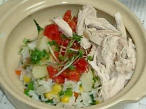 材料は鶏胸肉・白米・小松菜・ピーマン・ジャガイモ・ミックスベジタブル・トマト・ブロッコリースプラウト・オイル・サプリ