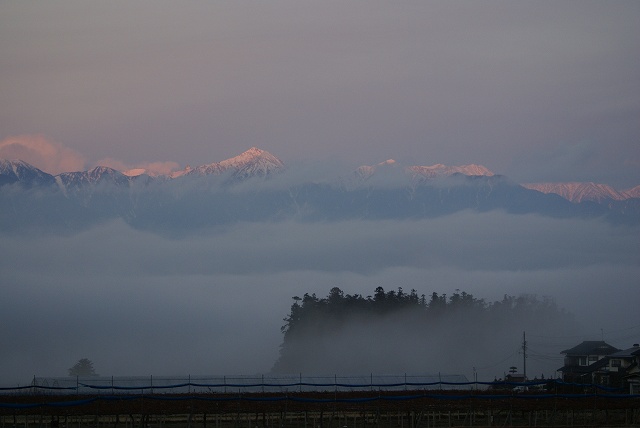 今朝は全国的に冷え込んだようですが、ここ三都松本地方も放射冷却もてつだって氷点下5度を下回った模様。今朝も霧の写真ですが前回の翌日のものです。前日はまるっきり霧の中で視界が殆ど利きませんでしたがこの朝は松本市街地が霧にむせいでおりました。霧に浮かぶ北アルプス。(槍、常念、横通岳)霧の切れ間から覗く常念。森と霧に浮かぶ燕、有明。あたかも竜の如く一筋の霧が横に伸びたちまち家々を包み込む。(左手にず~と長く伸びていたのですが望遠しか持っておらず・・・いまいち迫力に欠けました。)一方東の空は、一筋の雲が朝焼けに輝いて・・・。