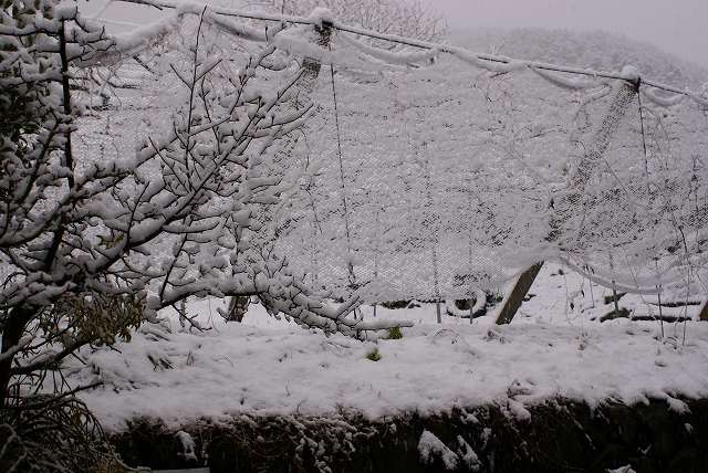 三都・松本地方昨日午後3時頃より振り出した雨が、今朝5時前から雪に変わり、野山は薄っすらと雪化粧。防鳥網に着雪した春の淡雪HP様に無加温ハウスから咲き始めたシャクナゲ ━ローズバロン━ を持ち出し撮影。このヒマラヤ系のシャクナゲ、(一説によるとサンギネイム系の交配種ではとも・・・)の色は紫味の無いスッキリした赤なので、邦産種の葉や木姿に此花が咲いたらと・・・。