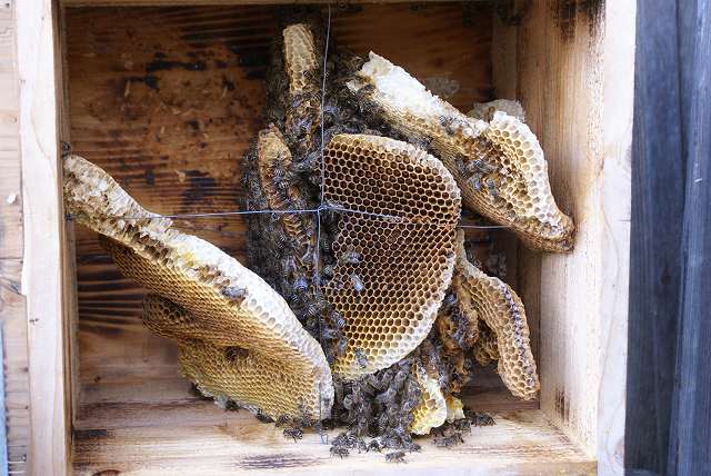 三都・松本地方の昨日はお昼近くから風が強く吹き始めました。それを予想したわけでは有りませんが、雨上がり後で農作業が少々やりにくかったので、前回内検出来なかった和蜂の内検を先にする事に・・・。内検には少し肌寒かったのですが・・・。内検したのは、捕獲直後に逃居した群で、前回の内検で育児圏が4枚と一番多かった群です。今までの巣箱は少し小さかったのと、巣クズが沢山になったので、十枚群の標準の巣箱に交換しました。蜜巣2枚を新たに入れた所へ、旧巣箱の蜜巣を入れ一枚目の育児圏の有る巣を入れ巣枠が計4枚となった所です。蜂たちは逃げ惑い巣底右側や隣の巣に逃げてしまいました。二枚目の育児圏のある巣枠を入れました。この巣枠からは蜂が刺激に幾分慣れてきたのか、大騒ぎにはなりませんでした。そして、三枚目の育児圏のある巣枠です。古い巣をかじり落として新しい巣に育児圏があり、右側の蜜巣との境に切れ込みがあるのが良く分かります。古い巣をかじり落として、新しい巣に産卵すると言うのは天敵のスムシ対策と言う目的もあるのではと・・・。四枚目の巣枠にさっと目を通すと、王椀が・・・未だ産卵はされておりませんでしたが・・・早ければ今月中には人工分蜂を行う事になるやも。今まで生活していた巣箱の底には沢山の巣クズが・・・。そして入れ替えた箱を元の場所に戻して・・・あら!蜂が入ってるようには見えませんね。伝統箱の群です。横倒しにして様子を見るのが面倒だったので、手鏡で巣の様子確認と、カメラを差し込んで適当にシャッターを切って三枚ほど撮影した中の一枚です。底板を引き抜くと、スムシの犠牲になった幼虫や蛹が・・・。