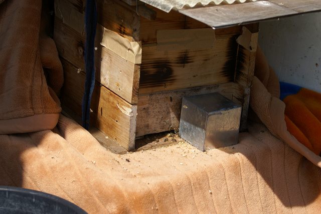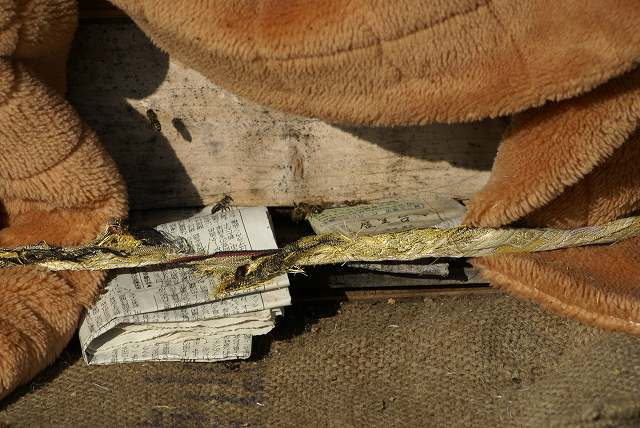 三都・松本地方は新年を迎えてから日中は穏やかな日が続いて居ります。昨年暮れも押し迫る27日朝、西洋ミツバチの師匠から電話があり、「先月ミツバチの駆除を頼まれ日本蜜蜂を捕獲して来てダンボール箱に入れて置いてあるが、群は小さいがどうやら女王が居るようだが持って行くか?」との電話を受け「え!こんな時期にもっと早く連絡・・・を」と内心思いながら二つ返事で貰い受けに行って来た。ダンボール箱の手を掛ける穴を出入り口しており、そこを新聞紙で塞いでやると言うのを断り、持参して行ったガムテープで塞ぎ黄昏の蜂置き場にセット、すぐガムテープを取り除き懐中電灯で覗くも全く蜂の姿が見えない「居るのか?」と思いながらもとりあえず毛布をかけその夜は帰宅。暮れに新たに加わった和蜂。 4日日中は気温4~5度、どうやら盗蜂に合っている様子。翌日温度が上がったのを見計らってダンボール箱を開けて見ると、出入り口の直下に一握りくらいの塊が・・・「こんな所に・・・見えないわけだ」この極小の群が越冬できるのか少々疑問、しかも巣クズを掻き回して見ても蜜巣は殆ど見当たらない、このダンボール箱では出入り口が上なので温かい空気が抜けてしまいとても越冬は無理と判断、盗蜂に遭い消滅した群の作りかけた巣がある重箱式の巣箱に払い落として新居に移転してもらいタッパーに入れた蜂蜜を補給して作業終わり。群も小さいし半数くらいは巣の欠片に峰球になっていたので、おお騒ぎというほどの事は無く・・・面布はいらなかったと思いながら面布を外し、収納しようとした面布に蜂が、「お前こんな所に来なんで・・・ん!良く見ると女王じゃん!おいおい!」あわてて抓んで巣門から入れてやる。女王の確認が偶然出来て良かったがはたして春まで・・・。縦長の伝統巣箱。どうもこの巣から蜜を盗みに行っているようだ。春に師匠から頂いた群。捕獲群。何番目の捕獲群か失念した。眺めているうちに狭めてある巣門から蜂があふれ出して大渋滞し始めたので、新聞紙を取り除いて全開にしてやるとまるで最盛期のように・・・。捕獲直後に逃去、捕獲した場所に戻り再捕獲した群。盗蜂に来た蜂と取っ組み合い中。こんな時期に盗蜂が出るとは想定外、時期が時期だけに激しくは無いが・・・。なにせ極小群なので・・・家の側に夕方引越し蜂置き場の様子を見ることに、これで治まらなければ縦長の伝統箱に貯蜜が少ないということになろう、実はこの群だけ貯蜜具合を把握してない他は皆持ち上げて重さをみたのだが・・・。