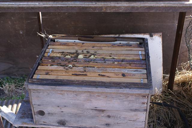 三都・松本地方3月になろうとしているのに、今朝の最低気温は未だ-7℃にも下がる。晴れればよい陽射しが射すのだが、なかなか気温が上がってくれない、法面はほぼ直角に日があたるので既に雪は無いが平らな場所がようやく溶けた。日陰は未だどっさり有る。日中は何とか5℃を越えてくれたので、気になっていた日本蜜蜂の巣箱を取り替えた。洋蜂の師匠から頂いた分蜂群で巣箱は借り物であるし、何よりも巣枠とふたの間に蜜巣を作られてしまったので・・・。昨年9月に内検しようとフタを取りかけたが、簡単に開かないので隙間から覗くと・・・こんな感じだったので、今処理して盗蜂にあってはと思い断念したが、本業が忙しくその後は全く内検すらしている間がなく年内は諦めていた。この時期だったら巣枠がべとついても逃居も出来ないだろうし、本格的な活動には少し間があるこの時期ならば盗蜂もたいした事はないだろうと、蜂には寒くて気の毒だがと思いつつ決行。育児圏は巣枠一枚だろうと思っていたのだが、三枚に野球のボール大からソフトボール大の育児圏があり既に羽化出房した所も・・・。何分にも陽射しは良くても風が冷たいので、手早くしてあげたかったので写真は同じ巣枠しか撮らなかったと言うより、不幸にも蜜にまみれた蜂はあれよあれよと言う間に仮死状態になるし、巣箱や蓋についている蜂を新居に誘導せねばらないしで撮っている余裕がなかった。と言うのが正直な所だった。蜜にまみれてよたよたしている蜂や、仮死状態の蜂をピンセット付き鋏のピンセットで抓み、守門に押し込んだり蓋を少し開けて落とし込んだりで・・・数匹の犠牲はあったが最小限に留められたのではないかと・・・とはいっても、守門から押し込まれた蜂が仲間の所まで登って行けたらの話であるが・・・ここはカラスの勝手でしょで、都合のいいように思っておこう。