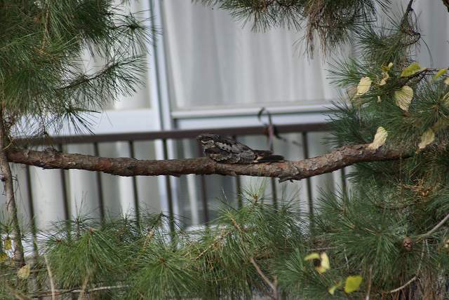 昨日の朝は松本地方郊外は薄っすらと木々を白く雪が覆いましたが、道路は幸い積もりませんでしたので、今まで例年より温かったので冬用タイヤに変えようかもう少し様子を見ようかと迷っていた人には大助かりでした。そんな、雪も解け始めた中リンゴを食害するヒヨドリ避けにと、作り物の鷹の鳥追いを取り付けていると、なにやら褐色の鳥が頭上をかすめるように背後から来て、裏庭の松の枝に平行に止まり・・・。ん~!なにやら鷹の姿に見えたがと・・・鷹は鷹でもどうやらヨタカのように見えるが、まさかヨタカは俺の記憶(当てにならない)によれば夏鳥のはず。そんなばかな~今頃ヨタカが~?最近は夏でもヨタカの声を聞く事がなくなってきたのに?こんな雪の中にヨタカが居るなんて信じられない!!。でもどう見てもヨタカだよ~!高校時代ヨタカの雛を育てた事があるから間違いない!近所のおじさんが鳥好きな俺に、山から捕ってきたキジの雛だと言って学校に行ってる間においって行ったと言う。キジの雛にしては歩かないし、餌も自分では食べない、手を近づけると口を開いて餌をねだるこんなキジが・・・?何だろう?雛なので何の雛なのかさっぱり分からなかったが・・・育雛用(いくすうよう)のヒヨコの餌さを練り餌にして与えて、飛べるところまで育て・・・ある夏の夕方学校から帰って餌を与えていると、ヨタカがなきながら飛び去って・・・その声に呼応して「キョッキョッキョッ」と雛が鳴くではないか「ゲ!お前ヨタカだったのか~」・・・。ヨタカの主食は昆虫のはず、まだ赤とんぼがよたよた飛んでいるものの、昆虫は殆どみえない・・・こんな所に何時までも居ると凍え死ぬぞ!第一餌が無いだろう~何時からベジタリアンになった~、ベジタリアンだって冬はむりだっぺ。サイトで調べた結果このヨタカは雄と判明しました。薄暗いのと逆光ではっきりしない画像ですが、初冬であると言う証拠の熟している柿が写っているのを乗せたくて・・・。ヨタカは保護色をしているので、人が近づいてもすぐには逃げないので撮影は楽でしたが、逆光で撮るさい半眠りだからとたかをくくってフラッシュを使用した所、以外にも素早く飛び立ってしまいました。眠かったのに御免。