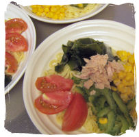 お昼、プールサイドですっかり暑さに参った我が家こんな日の、晩御飯は、夏の定番冷やしラーメンです!新婚当初、主人に教えてもらったメニューで普通の袋のラーメン(インスタント)を普通に茹でた後、麺を水で洗って冷やし付属のラーメンのスープを濃い目に溶かしてかけて食べます。ポイントは、沢山のお野菜!!暑い夏も、冷たいラーメンのツルツルっという食感で沢山のお野菜を食べることができます。ちなみに、今日の具はゴーヤの薄切りを茹でたものとワカメ、コーン、トマト、ツナでしたこれを食べて、夜の空手の練習は元気百倍!?今日も張り切って走っていました(笑)いつもどおり、私は最初のアップだけで汗だくで、ダウンでした(>_