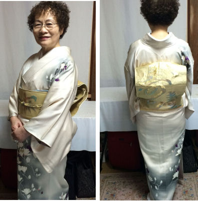 父の葬儀に予想以上の沢山のお花を頂いたお陰で我が家の実家はまるでお花屋さんのようになっています玄関から仏壇のある和室まで沢山の花に囲まれてありがたい限りですそんな中ではありますがボチボチと着付けのお稽古は再開いたしております助教授3級以上の方が受講できる花嫁専科の集中講義ですこの日はセンパイの先生と2人で組んで補正から帯結びまでみっちりお稽古していただきましたちなみに、この日の生徒さんの取り合わせがとっても可愛かった!!格子柄の木綿の着物に手作りのさくらんぼ柄の帯そして、半襟はスイーツ柄でしたなんとなくウキウキするそんな取り合わせですね(^^)