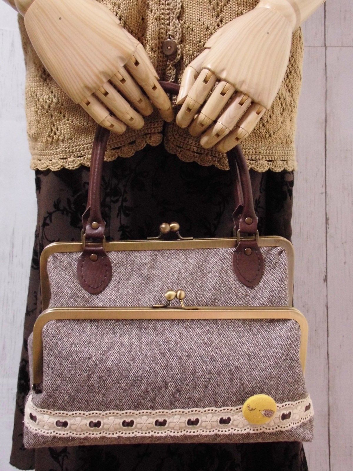 オコシ式カシメ留めの口金と、18cm口金を使用。持ち手と斜め掛けは気分で付け替えが出来ます。そして中は肉球