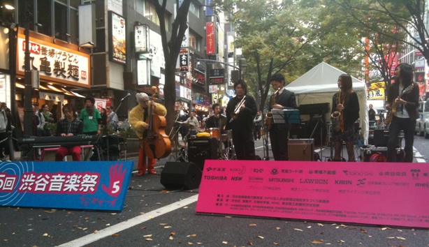 道玄坂通り会場たをやめOrquesta!!! 女子ばかりのラテンBig Band トロンボーンとかトランペットでなかなかステキな音を出してる人いたよ!鈴木勲OMA SOUND お目当てのオマさん Tpの中村さんのTweetで思い立っていってきました。 黄色い毛皮のコートをきたオマさん。 すごい独自な。オリジナリティあふれる音。 共演者はみんな若い人。 ある意味オマさんの学校のようでいて反対に一番ハッチャケている感じがすごい! 中村さんはその中でも若頭のように生き生きと吹いてた。 Swing ジャーナルで去年見かけた纐纈雅代さん(だったかな?)はあんな華奢なのに太い音。 最初にイベントの司会者からメンバー紹介があっただけで名前を聞き漏らしてしまったのが残念。纐纈さんのブログより拝借鈴木勲-Bass- 板垣光弘-Piano- 中村恵介-Trumpet- 早川惟雅、纐纈雅代-Alto sax- 井上銘-Guiter- 西村匠平-Drums-