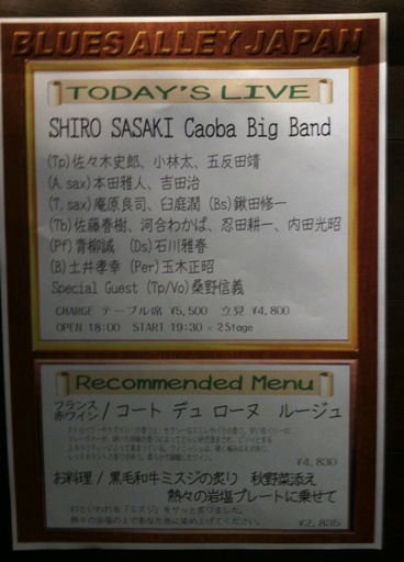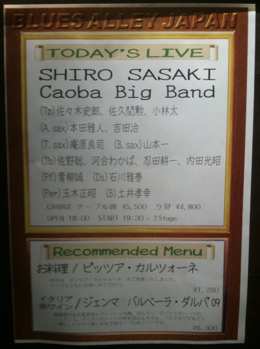 SHIRO SASAKI Caoba Big Band (Tp)佐々木史郎、小林太、五反田靖 (A.sax)本田雅人、吉田治(T.sax)庵原良司、臼庭潤 (Bs)鍬田修一 (Tb)佐藤春樹、河合わかば、忍田耕一、内田光昭 (Pf)青柳誠 (Ds)石川雅春 (B)土井孝幸(Per)玉木正昭★Special Guest (Tp/Vo)桑野信義 当日の私のツイートRoyal Street Blues by Shiro Sasaki & Caoba Big Band from Peace! #TwitMusic 今日はCaobaのライブ♪ 生ライブ中毒(略して生中)なので1ヶ月ぶりの生に朝から気もそぞろ♪posted at 08:06:54CAOBA BIG BANDあごー。メンバーが一部いつもと違ってたけどやっぱり楽しい♪ 青柳さんのローズの音も聴けたし、真正面から弾いているのも見られたし? 12月も行っちゃおう(#^.^#)posted at 23:28:31