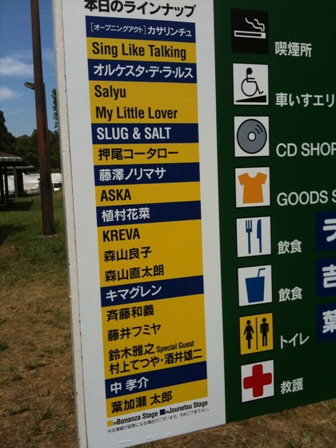 藤井フミヤ 佐橋 佳幸(g) 石成 正人(g) 斎藤 有太(Org,Key,Pf) バカボン鈴木(b) 小笠原 拓海(Dr) 田中 倫明(Per)1.Little Sky2.飛行船3.TRUE LOVE4.Blue Moon Stone5.DO NOT フミヤさんは市松模様のシャツ。何を着ても似合います。2曲目に佐々木 久美(Cho) 大滝 裕子(Cho)参加♪TRUE LOVE葉加瀬さんと柏木さんの入ったTure Love。今年はさらにオリジナルの佐橋さんのイントロ♪ティラララン が入ってます。バカボンさん(Cb)豪華すぎます(;O;)さらに、港区の葉加瀬さんからのリクエストで♪Blue Moon Stone再び久美さん裕子さんのコーラスが入り柏木さんははけちゃいました。それにしてもこの曲好きだぁ!!スキマスイッチ佐橋 佳幸(g) 石成 正人(g) 斎藤 有太(Org,Key,Pf) バカボン鈴木(b) 小笠原 拓海(Dr) 田中 倫明(Per) 佐々木 久美(Cho) 大滝 裕子(Cho)1.ゴールデンタイムラバー2.石コロDays3.センチメンタル ホームタウン4.さいごのひ5.全力少年 情熱初登場のスキマくん。そう言えば、去年は情熱バンドにスキマくんでよくやっている新井ラーメン健さんがギターで参加していたけど、今年は師匠の佐橋さん。♪さいごのひ は葉加瀬さんとスキマの二人、3人で。素敵です。そして、最後にバンドで♪全力少年 ですよ。盛り上がらないわけがない!ぴょんぴょんしちゃいました!鈴木雅之佐橋 佳幸(g) 石成 正人(g) 斎藤 有太(Org,Key,Pf) バカボン鈴木(b) 小笠原 拓海(Dr) 田中 倫明(Per) 佐々木 久美(Cho) 大滝 裕子(Cho)1.LOVE with 葉加瀬2.ルビーの指環3.愛し君へ 4.TAXI5.ロンリー・チャップリン相変わらずダンディなにぃさんです。なのにしゃべるネタはなかなかベタです。さださんのMCパクったりね。黒いスーツにエナメルの靴♪葉加瀬さんもそれに合わせて暑いだろうにスーツにエナメル靴なところをアピール。スタンダードのLOVEに日本語詞をつけて「粋」って感じですね。マーチンさんは日本語で歌っても黒い雰囲気が消えないからすごい!そして。。。2曲目は!!!なんでなんで?青柳さん(Ts)とナギさん(As)が出てきてる!!!イントロ始まった。うぉぉぉぉぉ~ルビーの指輪ですよ。それが、マーチンさんの世界観~~紫色な世界~~で繰り広げられて。。。それ以前に、青柳さんとナギさんが佐橋バンドで出てくるっていうフォーマット!!私、これを、SLTで繰り広げられることを強く望んでいたわけですよ!!!ずる~~~い!マーチンさんとは言え、かっこいぃ♪愛し君へ は森山直太郎君の曲のカバーらしいんだけど完全にマーチンさんの世界。直太郎君の不器用なくらいの清廉さとは反対の大人の「愛」って感じでしょうか。♪TAXI1番をマーチンさんが歌って、2番からソウルシスター聖美さんが登場!やっぱりこの姉弟すごすぎます。久美さんがオルガン弾いていたのはこの曲ともう1曲だけそして、やはりこの二人がそろえばこの曲です。♪ロンリー・チャップリン桑マンさんが白塗り殿様に呼ばれていて出てこれないということで葉加瀬さんがいつもはTpの旋律を弾いてました。ほんと、そうすると、違う雰囲気になるのね。面白い。ブログはこちらトータス松本佐橋 佳幸(g) 石成 正人(g) 斎藤 有太(Org,Key,Pf) バカボン鈴木(b) 小笠原 拓海(Dr) 田中 倫明(Per) 佐々木 久美(Cho) 大滝 裕子(Cho)1.明星2.マイウェイ ハイウェイ3.バンザイ~好きでよかった~4.ハッピーアワー5.ガッツだぜ!! 3,5曲目しか知りませんでしたが楽しそうでいいね。トータスさんもMCの着地点を考えずに話し出す人なのかな?不思議君でした。バンザイで久美さんがオルガン弾いて有太さんがKey。4,5曲目で葉加瀬さん、5曲目で柏木さんがコラボしてました。4曲目はバカボンさんはCbだった。ガッツだぜ ではPVで見たようなお約束の倒れて起き上がるようなパフォーマンスはしなかったね。残念。時間もなかったしね。Rake1.誓い2.First Sight 3.100万回の「I love you」1曲目はしっとりとエレピで2,3曲目はギターで3曲目がCMで有名な曲♪キャッチーで何度でも聞きたくなるいい曲だね♪葉加瀬太郎柏木 広樹(Vc)青柳 誠(Pf)西嶋 徹(B)田中 義人(g) 大島~ナギ~俊一(Key)河村~カースケ~智康(Dr) 藤井 珠緒(Per)1.エトピリカ2.Girls Talk3.ひまわり4.The Mission to Complete5.情熱大陸毎年この方のライブを野外で聴くと夏も終わりなんだとしみじみしてしまいます。♪エピトリカではナギさんがSSでソロとってたね。ナギさん葉加瀬さんのツアーにも参加していたんだ。最近気づいた(^_^;)♪Girls Talkは演奏後タイトルを聞いてナルホドと思うようなかわいい曲だったな。♪ひまわりは葉加瀬さんが一番大好きな花だそうで、いつか素晴らしい曲ができたら付けようと思っていたタイトルらしい。今年の情熱大陸のT-シャツもひまわりをイメージしてるのね♪ナギさんがフルート吹いてたな♪最後は♪情熱大陸 豪太さん倫明さん小笠原君も参戦♪ナギさんはBs♪義人さん先攻松原さん後攻のギターバトル!カースケさんたまちゃんのDr vs Perバトル!ナギさんBsと青柳さんPfのバトルもちろん柏木さんのエビぞりチェロも健在♪思いっきりきゃ~きゃ~言っちゃいましたよ♪ワイパーしまくりです♪あぁぁぁ~終わっち