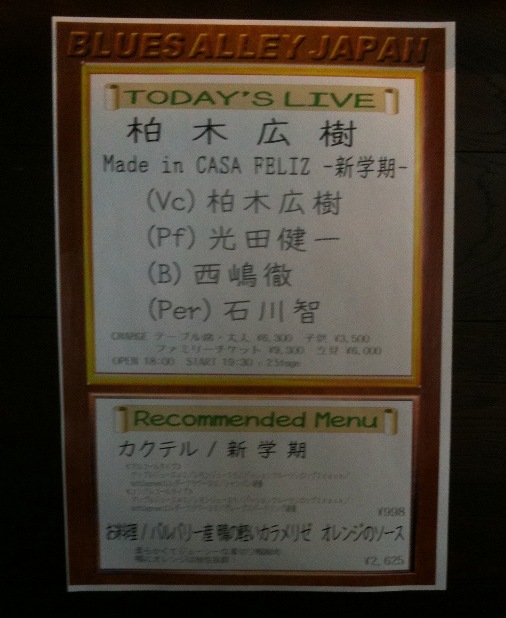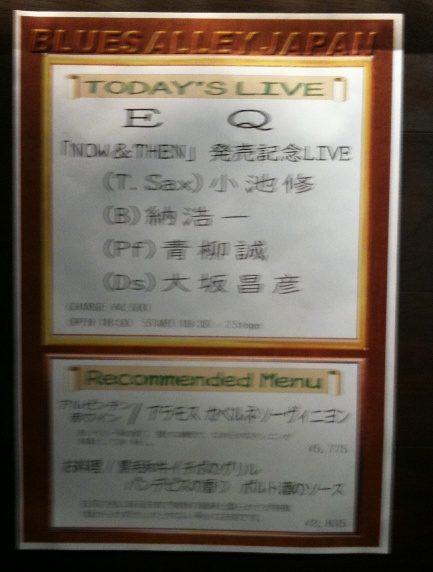 Red Pepper & Aromatic Spices(納)Real Mash(青柳)Life In The Bright Side(納 新曲)So Long(大坂)Serendipity(大坂 新曲)It's Urgent(大坂)MAZUKA(小池 新曲)Cresting(青柳 新曲)Exile(大坂 新曲)HANA(小池 新曲)Taking A Walk(大坂)Dump Trane(小池)Milesmiles(納)初めてのお店。渋谷の駅から思いのほか近くてよかった。生音で聴けるお店ですね。小池さんのテナーからも息づかいも聴こえ納さんのベースも心地よく響き大坂さんの繊細なスティック捌きまで見えて青柳さんのノッた姿が見れて。何にしても4人の音の会話がつぶさに見られて。。。幸せだなぁ。。。よかったなぁ。秋にNew Albumのレコーディングをするとのことで新曲がたっぷり。印象的だったのは、CrestingEQ版のFusionという印象。小池さんの吹くメロディーラインもそうなんだけど、それ以上に大坂さんのシンバルづかいも珍しくPopな感じ。あと Exile例のグループのことじゃなくて漂流者という意味の方の雰囲気。いい感じです。Hanaも素敵なバラード♪New Albumが楽しみだな。