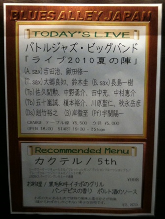 BATTLE JAZZ BIG BAND Live2010夏の陣 @BAJ 2010/08/121st♪The First Step♪Samba De Haps♪Battle Of The Bop Brothers♪Let's Eat Cactus♪My Favorite Things♪Do It!2nd♪Good News♪Jump!-Theme of BATTLE JAZZ BIG BAND♪Casa Forte♪Gracious♪Explosionen.♪Snakes(A.sax)吉田治 鍬田修一 (T.sax)大郷良知 鈴木圭 (B.sax)長島一樹(Tp)佐久間勲 中野勇介 田中充 中村恵介(Tb)五十嵐誠 榎本裕介 川原聖仁 秋永岳彦(Ds)則竹裕之 (B)岸徹至 (P)宇関陽一今回はリズム隊のまん前あたりに座ることが出来て、迫力満点で楽しみました。今回のもうけモン!Tbの五十嵐さんと榎本さんの音が太くてカッコいいこと!則竹さんのソロ~宇宙との交信~もすばらしいね。何というか、ドラムだけなのに、頭の中にメロディーが聴こえてくるというか。。。不思議な感覚です。とにかくこのリズム隊。よいです。宇関さん、岸さんはDuoでもライブをやってるし、そこに則竹さんが加わることもあるそうで。このTrioだけでも聴く価値有りなのに、生きのいいHonesが爆裂していて♪レコ発ライブということで5thからの選曲が主でした。今回から、高速Onlyの縛りをゆるくしたそうで吉田さんのステキなバラードやMy Favorite Thingsも演奏されました。田中さんのフリューゲルフォンがやさしく響いていて。とはいえ、そこはBJBBガツンというところもあり一味違ったMy Favorite Thingsだったかな。吉田さんのバラードは、今後このバンドが渋~い演奏も出来るようにしていきたいと言うことでも選曲されたようです。1stの最後の曲♪Do it!ASaxの2本がかっこよかった~♪そういえば、吉田さんが、自分の曲を選曲ができてBig Bandのリーダーってタマリマセンね~ってうれしそうな顔していたっけ。2ndの五十嵐さんFeat. 曲♪Casa Forteもよかったなぁ。則竹さんのテーマともいえる♪Explosionも聴けたし、最後アンコールでは♪Snakesも聴けたし♪もう、帰宅中の電車の中、頭の中は♪Snakes一色って感じに脳内スピーカーが鳴ってたし。CDもgetして吉田さんにもサインをもらってホクホクして帰宅しました!ついでに。サマーナイトジャズ@ミューザ川崎 2010/08/10大坂さんのツイートに誘われていってきました。その時の私のツイート@masahiko_osaka さんと @mikitoshio さんのツイートに心揺れてミューザ川崎で佐山雅弘さんのグループでコンサートうぃる。「ミューザ川崎は本当に素晴らしいホールなので、それを体感しにくるだけでも価値がありますよ」って言われちゃうとやっぱりね(*^_^*)Pf:佐山雅弘Tp:岡崎好朗Ts:三木俊雄Ba:井上陽介Dr:大坂昌彦Vn:寺井尚子“Bitter Sweet”(ラフマニノフ:交響曲第2番第3楽章の主題による) チック・コリア:ラ・フィエスタ 佐山雅弘:Love Goes Marchin' OnB.ゴルソン:Along Came BettyJ.ティゾル:キャラバン