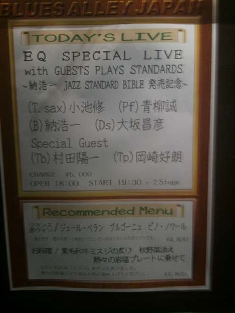 EQ SPECIAL LIVE with GUESTS PLAYS STANDARDS~納浩一 JAZZ STANDARD BIBLE 発売記念~@BAJ 2010/12/01EQ:小池修Ts,青柳誠 Pf,納浩一 B,大坂昌彦 DrsGUESTS:村田陽一 Tb,岡崎好朗 Tp1st1.FREDDIE2.BLACK NILE3.PRELUDE4.IF I WERE A BELL5.MILESMILE(from EQ by K.Osamu)2nd1.WATER MELON MAN2.NIGHT AND DAY3.IN A SENTIMENTAL MOOD4.SHINY STOCKINGS5.WHAT IS THIS THINGSenc.MILESTONE実はこの日のことを書きたくて最近一気に溜め込んでいた写真を載せたと言うくらい最高のライブでした!Jazzを聴き始めてはや2年ほどなのですが、いつまでたってもJazz初心者。それと言うのも、なかなかスタンダードの曲を聴く機会が少ないのも理由の一つかな。オムバニスで聴いていても曲名を注意して聴く事はないし、CDを買うときも、まず、プレーヤーの名前を見て選んだりして。そんな中、大好きなJazz BandであるEQのベーシスト納浩一さんがJAZZ STANDARD BIBLE(通称:黒本)というスタンダードの曲の楽譜集を発行。それに伴って、いつもはオリジナル曲を譜面無しで演奏すると言う縛りを持つEQがスタンダードをトリッキーなこともせず、譜面どおりに演奏する!という願ってもないチャンス♪ほんとはこの時期他のライブを見に行こうと計画を練っていたのが一発で吹き飛びました。実際、私でも曲名は知らなくてもテーマ部分は聴いた事がある曲ばかり。いつものカルテットとは違ってフロントがTb,Tp,Tsの3管+ピアノトリオのセクステットさすがにちゃんとアレンジをしてライブに入ったそうです。大坂2Days、名古屋とライブを重ねた上での東京ライブ。それぞれが心からメンバーの演奏を信頼して、自分の音をぶつけているのがカッコいいのなんのって。ピアノトリオはホントに一つの音に他のメンバーが瞬時に対応してうわっぁそう来るか!!ていう展開がエキサイティングに進行して。ソロも、こういう言い方は大変失礼だけど、うまい!!!!おいしい!!!!くぅ~~~っ!!!青柳さんがノッて弾いているときの姿も好きだ~!大坂さんのドライブがかかった襲い掛かるようなドラミングも、ブラシで優しくなでるような音も好きだ~!!納さんのソロは気持ちがふわぁ~っとなってシビレル~♪言葉じゃうまく表せません。EQのフロントマン。小池さんはいつにも増して色気のある音。夏のライブで初披露の小池さんモデルの銀色Saxもだいぶんなじんで着々といい感じになってるのかな。Tpの岡崎さんは、夏のミューザ川崎のサマーナイトjazzに続いて2回目。ハイトーンの音がクリアでスコーンと気持ちいい♪そして今回、見惚れてしまったのが、Tbの村田陽一さん。普段からJazzに限らず、Popsのクレジットの中にもよく名前を見つけられる方ですが、生は今回が初めて。演奏中の立ち姿がまずカッコいい!そして何より音が気持ちいい。パリッとした音も、Tb特有のスライドさせていく音も。Tbってこんな音だっけ?って思うくらい色彩豊かな感じがステキでした。私は、子供の頃にピアノの練習が嫌いだったので、楽器を演奏しようと思わなかったんだけどこんなステキな曲たちの楽譜があるなら、コードの勉強ぐらいしてもいいかな。黒本買っちゃおうかな。イヤでも、まったく弾けないし。。。でも、EQのお手本音源だけでも楽しめるし。。。それも失礼か。。。?なんて、ちょっとワクワクしながらAmazonのページを眺めていたりします。このセクステット。今回スペシャルライブとして1回限りの予定だったそうですがメンバーもメチャクチャ楽しかったようで今後パーマネントバンドとして活動してくれるとのことでまた楽しみが増えてしまいました。