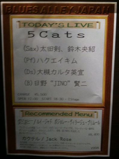 5CATS @BAJ 2010/11/28太田剣(ss,as)鈴木央紹(ts)ハクエイ キム(p)日野JINO賢二(b)大槻KALTA英宣(ds)Twitterでフォローしている剣さん、央紹さん、KALTAさんの秋口のツアーの様子があまりに楽しそうで思わずチケットを取って参戦しました。JINOのまん前の席だったせいもあるけど、ムキャ~カッコいい♪───O(≧∇≦)O────♪って感じでした。ホントは指10本ぐらいあるんじゃないの?次々と繰り出される音がビシビシッとキマッテいてハンパないし、KALTAさんとの迫力のグルーブが押し寄せてきて気持ちよかった~♪KALTAさん(ミーハー的に顔が好きです)のドラミングは力強いいたずらっ子って感じなのかな?(素人の感想ですが)剣さんとハクエイさんはおととし横濱Jazzプロムナードの時にカルテットで見て以来ステキだなぁと。剣さんと央紹さんのDuoもゾクゾクッと来るほど良い音していたなハクエイさんは席が少し遠かったのであまり見れなかったんだけど演奏中はおすましさんな横顔だったけど、少しMCをしたときに紅潮してたから実はアツい人なのかな?女性ファンがたくさんいたね。MCは全部JINOがやってたんだけど、デーブばりのダジャレ帝王。剣さん曰く「JINOが一番おもしろいから」って。NY育ちのJINO。日本語は話せるけど漢字が読めないとのことで、メールを打つ時は全部ひらがなで打つらしい。そっか。日本語はひらがなだけで書くとダジャレ天国なんだよね。それでかぁ。なんて妙に納得したりして。来年辺り、1stアルバムが出るらしいので今から楽しみ。またライブ行っちゃおっかな♪