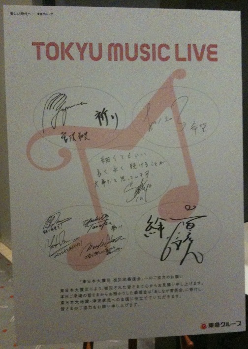 塩谷哲Presents東急ミュージックライブ 2011.06.15上妻宏光、松たか子、宮沢和史、塩谷哲&キャラメルバンドキャラメルバンド:坂田学(Dr)、井上陽介(Cb)、田中義人(Gt)、カルロス菅野(Per)東急ミュージックライブは毎年招待券に応募しているのに10年近く外れ続けているの。今年はkanapanに誘ってもらっていってきました。Saltさんのホストでのライブソロからしっとりとはじまりました。ゲスト最初はAGA-SHIO♪上妻さんの美声も聴けたしShufflin'CityのAGA-SHIO Verも聴けてHappy♪松さんは少し緊張していたのかな?前に聴いたより声が出ていなかった残念。昭和歌謡でいい曲ということで歌われた♪黄昏のビギン題名は知らなかったけど、記憶に残っていたいい曲。素敵でした。休憩時間を挟んで(休憩時間中にピアノの調律♪いつも同じ方だと思う)キャラメルバンドなぜキャラメルかというと。。。最近スィーツブームだから。。。スイーツといえば。。。生キャラメルとか塩キャラメルとかあるでしょ。。。ってことでキャラメルバンド。。。相変わらず不思議君のSaltさんです。このバンド、塩谷哲Trioから陽介さん、塩谷哲Groupから義人さん、坂田さん、ラテン関連からカルロスさんとSaltさんのいろいろな音楽性から集めた感じ。皆さん一流ですよ。カッコいいことこの上なし♪陽介さんのSoloも素敵♪もっともっとこのバンドで聴きたいな♪3人目のゲストは宮沢和史さん2曲目にやった美空ひばりさんのカバー♪みだれ髪島健さんのアレンジ加藤登紀子さんののタンゴ調Verのカバー♪宮沢さんが陶酔して歌っている姿が印象的。♪島唄では上妻さんも参加津軽三味線と沖縄の三線の競演ですね津軽三味線は凛とした音が魅力的。三線は柔らかな音が素敵!♪風になりたいでは松さんも一緒に歌って楽しかったな~最後はSaltさんのソロで締め。やっぱりSaltさんのピアノの音はキラキラしていて素敵だね~