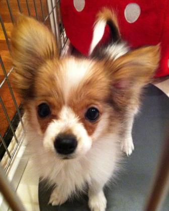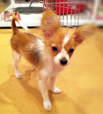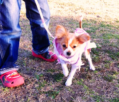 パピヨンネタが続いていますが...今日は午前中は手芸仲間が来て、前回カリグラフィー教室を欠席した友人にバースデーカードの書き方を教えてあげながらランチしました。そして午後はSenyaSのテニスの送迎にPippiと共に出かけて、レッスンの間近くの大きな広場のある公園に行ってみました。抱っこ散歩のつもりで行ったのですが、ちょっと地面に下ろしてお水を飲ませたりしたら、意外にも歩いてみる気になったようで、地面の匂いを嗅いだりしながらウロウロし始めたのですっ♪昨日までは地面に下ろしてもブルブル震えながら固まっていたのに、今日はもうスタスタです。初めて芝生の上に下ろしたのが良かったのかな?Pippiのお里でも芝生のドッグランはないのに...不思議です。地面の砂や草を食べまくっちゃっらどうしようと心配しながらも、我慢して見ていると、案外平気でした。しまいにはグイグイ引っ張るくらいの勢いで小走りし始めるくらい。そしてQunieSが「あれ、パパは?」と声をかけたら「ん? どこ?」というように立ち止まって首を伸ばして遠くを見ていたので面白かったです。そのうち広場に来た柴犬っぽい子と鼻を突き合わせてご挨拶しました。飼い主さんにも尻尾をフリフリ足元を周ってご挨拶していました。次に会ったワンちゃんは、Pippiか近づこうとしていたら「この子激しいから離れていた方が良いかも~」と飼い主さんが伝えて下さったので、引き留めて「バイバイ」しました。ところが、相手のワンちゃんが「Bow!!」と威嚇の一声を上げたので、チビのPippiも負けじと応戦...「キャンキャン!!」と何度か吠えていました。先に会った子と同じような体格でも、性格が全く違うんですねぇ。面白かったです。最初に会った飼い主さんに「今日が初めてのお散歩なんですぅ~」と話したら「まだお子ちゃまなの?」と聞かれ「4カ月です」と答えると、「ずいぶん落ち着いてるのねぇ」「この頃ってしっちゃかめっちゃかにコーフンしちゃうものよぉ~」と言われました。Pippiはやっぱり大人しめな性格のようです。今朝QunieSの友人が来た時も、普段家族に見せたことがないくらいに尻尾をブンブン振って大歓迎してましたが、「声、聞かないよねぇ。あんまり鳴かないの?」って言われました。こんなに早く地面に慣れると思わなかったので、お散歩コースの考察に本腰を入れなくては...と焦ります。とりあえず、今度はボールを持って長いリードも持って今日の公園に行こうっと♪そして拾い喰いの阻止の仕方など、子供達と練習しながらお散歩に慣れていかないとですね。