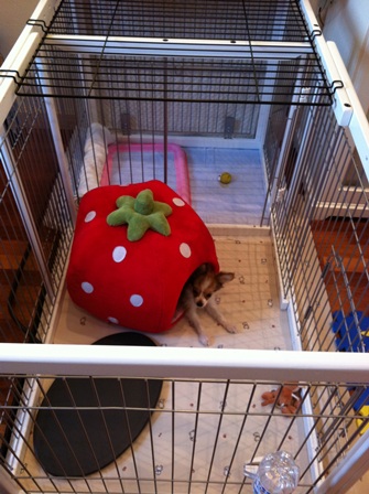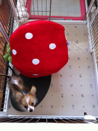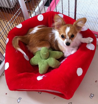 ケージの柵越しに撮った今日のベストショット♪昨日我が家にやって来たPippiですが、今日さっそくお留守番してもらっちゃいました。体調はすこぶる快調ですが、家に帰った時にケージの中がどうなっているのか、寂し過ぎておかしくなっていないか、とても心配でした。今日は区の子供会連合主催の『こども会まつり』というものがあり、一家総出で駆り出されたのです。できるだけ留守にする時間を短くしようと頑張って、当初9:00~15:30くらいまでのところを、時間差で出発して3時間ほどの留守で済むようにしました。その甲斐あってか、トイレにウンチが転がっていたこと以外は全く問題なく、ケージの中でお座りして出迎えてくれました♪お留守番中にお昼ご飯の時間を迎えるので、少しずつ食べられるようにKONGにエサをペースト状にしたものを詰めて与えたのですが、穴の口から近い部分を食べただけで、あまり食べなかったようです。慣れてくれたらまたお留守番の時に便利なんですけどねぇ。Pippiは一人遊びが楽しそうだし、少しかまった後一人にすると暫くは「キュンキュン」言いますが、すぐに諦めて寝たり遊んだりしています。夕べも最初は低い唸り声を出していましたが、すぐに静かになりました。家族は皆2Fで寝るので、Pippiが夜泣きしたとしても気づかないようです。まだウチに来て2日目ですが、ケージを仕切ったトイレ側中心で排泄をするようになり、ベッドが置いてある側のペットシーツはもう外してしまいました。さっきお夜食を食べた直後はベッドルーム側でオシッコをしてしまっていましたが、それ以外はトイレでしています。この調子で順調にトイレトレが済むと助かります。緊張のせいでお腹が緩むことがあるとか、食欲が落ちるなどと聞きましたが、Pippiについては今のところ大丈夫そうでホッとしています。まだ気が抜けませんけどねぇ。遊びたい一心で、ブラッシングの時にじっとしていてくれないので、コツがないか勉強しなくては!!SenyaSが産まれた時のようなおっかなびっくりのおぼつかない手つきでのお世話がなんだか笑えます♪「育児は育自」と言いますが、ペットについても同じことが言えるんだなぁと思います。