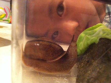 我が家にツムちゃん(くん) & アメちゃん(くん)が2週間お泊りすることになりました。彼らの正体はカタツムリ...。「大きい方がツムちゃんでねぇ、小さい方がアメちゃん。ツムくんでも良いし、アメくんでも良いんだよ♪」って紹介してくれました。HaryaSが幼稚園から預かって来たのです。希望者がジャンケンして勝ったんだそうです。ひぇ~~~っ!!!!!こんなに巨大なカタツムリ、見たことないかも!!もしあったとしてもそれは30年くらい前のことではないでしょうか?そもそもンなもの飼育したことなんてありません。どうやって飼うのか図鑑で調べさせました。食べ物の色がそのまま糞に反映されるとか、とがった鉛筆を並べたところを平気で渡ったり、糸も器用に渡ったり、図鑑で調べるとイロイロ実験したら面白うでした。これはSenyaSの自学自習の宿題に使えるな♪早速キャベツを与えてみたところ、たまたまささくれ立ったような繊維質な部分を結構なスピードで吸い込んで食べているシーンを観察できて楽しいです。▲ ツムちゃん(くん)▲ アメちゃん(くん)だけど、しっかり管理して2週間後に無事に幼稚園に戻さなくちゃならないので大変です。気が抜けません~っ!!