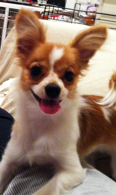 ようやく、Pippiの狂犬病予防接種を受ける日が来ました~。生憎の雨で、お散歩がてらというわけには行かず、車で出かけました。玄関先まで来てMacSが「俺は行かなくていいの?」行きたそうに聞いてきたので「行きたかったら行っていいよ!! 運転してね~♪」と、連れて行ってあげました病院に入るなりどこかから聞こえるワンチャンの鳴き声に反応して、少し吠えていましたが、「しーーーっ」と言って放っておいたら「きゅーんきゅーん」という鳴き方に変わりました。不安になったのかな?診察室に入ってクレートから出そうとしたら、いつも以上に拒んでいて先生に笑われました。体重は先月に比べて500gくらい増えていました。順調~♪「体重増えてますね」と言われて「はいっ、エサ増やしました♪」と得意気に答えちゃいました。注射を打つ前に洋服を着せようとして足を持ったら「きゃいんっ」悲鳴を上げることがあると話して注意深く四肢をチェックして頂きましたが、特に異常は見られないということで一安心。夜中に一度だけ吐いたけど、その後元気だったから受診しなかったという話もしたら、犬や猫は意図的に吐くことができる生き物だから、吐いた後にグッタリしているとか、何か他の要素がセットになって現れていたら受診して、いつも通りにしていたなら心配ないと言われました。よかったぁ。ということでいよいよ注射!今回はQunieSが首輪を抑えていました。頭を低くして、PippiとQunieSの顔を近づけているように言われ、「いい子ね、大丈夫だよ」とか声をかけながら顔周りを撫でてやりました。注射を打った瞬間は「きゃんっ」と小さく鳴いたものの、その後薬が全部入るまでの間はちょっとお尻を気にしながらも大人しく待っていました。先生に「大人しくなりましたね」と言われました。「家ではすっごく元気ですけどねっ」と言いました。人懐こいけど内弁慶です。今日は大人しく過ごしてもらわなければならないので、あえて午後は出かけました。子供達が習い事の間はQunieSの学生の頃からの友人とランチと買い物をして、夕方町田に一緒に行って、そこでQunieSの家族と合流しました。そしてみんなで東急のレストランフロアの一角で夕ご飯を食べたのですが...ずいぶん短いスパンで戦闘機が飛んでくるので、話ができないくらいでした。町田上空が賑やかでした。北朝鮮の衛星打ち上げの影響かな?QunieSとMacSが結婚式を挙げたのが2001年の10月。9.11のあった後の10月なので、下見に行った時には今日と同じくらい賑やかでした。幸い挙式の間は通りませんでしたけど。そんなことを思い出しながら、おいしいパスタを頂いて帰ると、Pippiはいつもの調子で「おっ帰って来たのね?」という感じで軽くしっぽを振るだけのドライなお出迎え。さすがにケージに近づいて扉を開けてあげるような仕草をすると嬉しそうに立ち上がったりしますけどね。最近は出してもらいたい時に誰かと目が合うと、すかさずトイレでオシッコをして見せます。それでご褒美に出してもらうという算段です。出してもらうと暫くしてウンチをお部屋のどこかでやらかしてくれるんですけどねぇ~(涙)ケージから出る前に全て済ませてもらいたいです~。