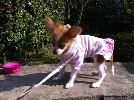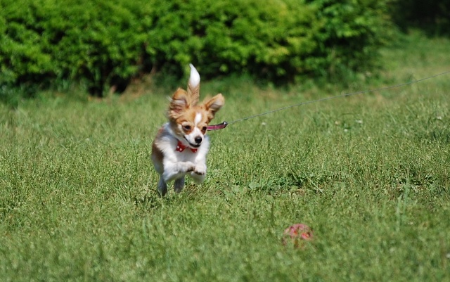 だいぶお散歩...外を歩くことに慣れた様子のピッピ。昨日SenyaSのテニスの間に買い物がてらコートの近くをお散歩した帰り、ずいぶん元気に走るなぁと思ったら、今日は庭に出るなり走り出して、車か近くを通る時とか何か気になる物や草を発見した時などに足を止める程度で、殆ど走っていました。SenyaSが短いリードを持って一緒に走ったのですが、引かれ気味で下り坂では危険なくらいでした。というワケで、初の動画です♪▲ たった7秒の動画ですが...途中で「これはイカン!」と思い、慌てて「ツケ」の練習を始めました。走り出そうとしたら「ピッピ♪」と呼んで、こちらを向いたらおやつ(ポーロの1/4)を与える。というのを繰り返しました。でも...黙っているとすぐに走り出そうとするので2・3歩進むごとに名前を呼んではおやつをあげて、なかなか大変でした。お散歩に慣れてくれたのは良いですけどねっ。普通に歩いたら30分の道のりですが、1日1回じゃ足りないのかと思うくらいで、お散歩の後も元気一杯でした。夜はさすがに疲れたしく、ソファで寝てしまいましたけど♪
