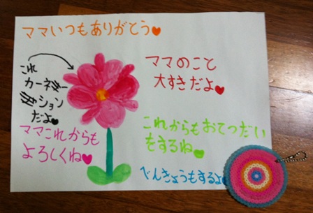 毎年母の日にはMacSが通っているテニスコート主催の大会があるので、今年も朝早くから出かけて行きました。QunieSが起きると子供達がリビングで固形絵具を使っていてビックリ!!「汚すからやめて~っ!」と一言。2Fに移動して暫くするとSenyaSが降りてきて、「あげる~っ」と持って来たものがコレ さっきリビングで書いていた絵のようです。「ありがとう~」と言いつつ、内心ちょっと「失礼しました」とも思いました。最初から子供部屋でやってくれたらいいのに、TVを観ながら描きたかったからリビングでやっていたんですねぇ。以前HaryaSが絵の具を飛ばしてソファカバーを汚したことがあるので、やはりやめてもらわなればなりませんが、せっかくのご好意にケチを付けた感じになってしまいました。SenyaS自身がまったく気にしていないか良かったですけど。朝から父と母が来て庭の手入れや物置の前に目隠しになる塀を作り始めてくれました。QunieSはお使いに行ったりPippiのお散歩に行ったりと出たり入ったり...なんだか疲れましたぁ。SenyaSは新しい自転車に乗り、HaryaSは相変わらずの小さい自転車に乗って、QunieSはPippiを連れて小走りで追いかけたり待ったり...往復30分くらいのパン屋さんに出かけた時は「なんでママだけ走ってるのよぉ~」と母の日なのにいたわってもらえず不満タラタラでしたぁ。子供達はおかまいなしに楽しそう♪だからまぁいいか...。QunieSは先日作ったプリザのアレンジを両家の母にプレゼントしました。MacSの実家に行く時はQunieSの自転車にHaryaSを乗せて行きました。じゃないとまた走らなくちゃならなくなりますからねぇ。やせる前に骨折しそうですぅ~。とにかく出たり入ったりを繰り返しました。雑草のなくなった庭を眺めて「やっぱり頑張って洋芝入れようかなぁ~」と考えちゃいました。最近は種を仕込んであるシートがあって、簡単に芝生か出てくるらしいのです。洋芝は夏の管理がとても大変ですけど、今度こそ頑張ろうかなぁ~と思います。貼って“ムラなく”生やしましょう♪冬場にも枯れること無く一年中緑色を保つ西洋芝を使用!芝生シート 5m2入り簡単!地面に芝シートを貼るだけ一年中緑の西洋芝が育ちます。[自然応用科学]ぴたっと貼るだけ!西洋芝(芝生シート) [芝生]